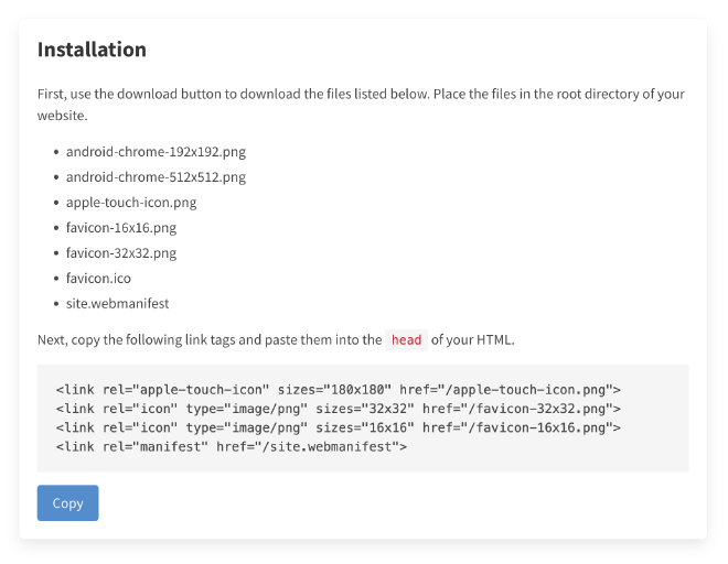 BlowFish默认使用一只河豚(?)作为网站图标,还挺萌的,但是我还是想换成比较有个人特色的图标,在此推荐favicon.io这个网站,上传图片就能一键获得所需图标文件,然后按照操作把代码复制到自己的项目里的head.html里就可以了。