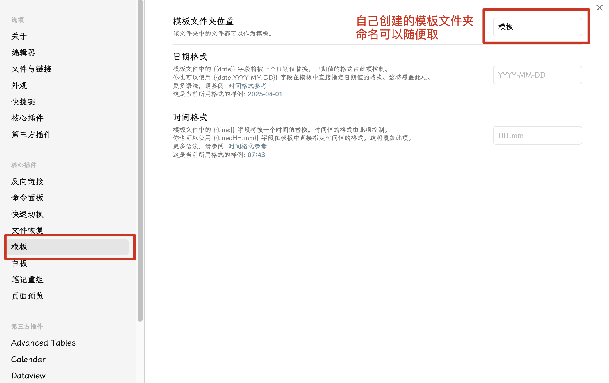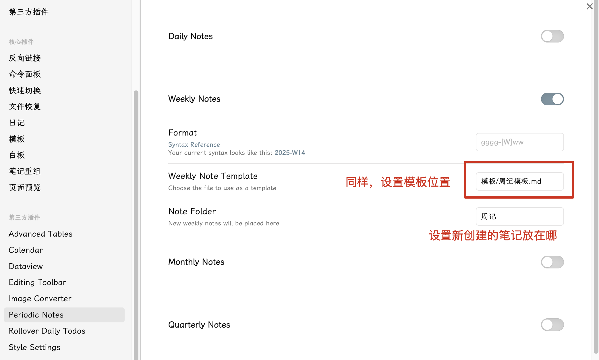 我下载了Periodic Notes这个插件,设置如图。也可以用系统自带的日记功能。