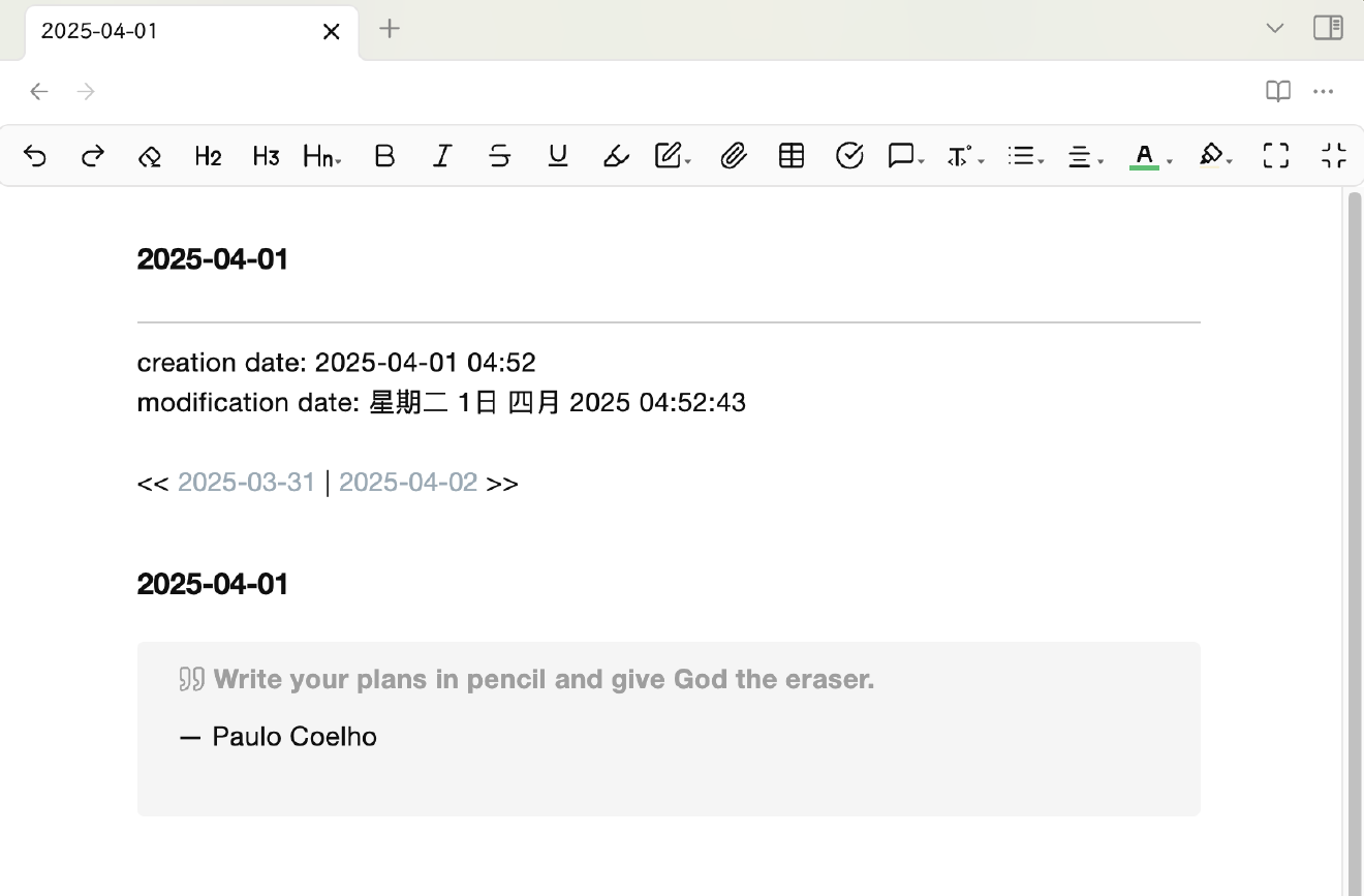Templater是一种模板语言,可让您将变量和函数结果插入到笔记中。它还允许您执行操作这些变量和函数的 JavaScript 代码。