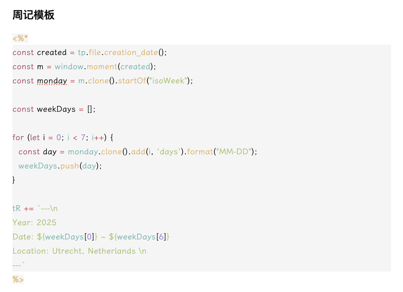 <%* const created = tp.file.creation_date(); const m = window.moment(created); const monday = m.clone().startOf("isoWeek"); const weekDays = []; for (let i = 0; i < 7; i++) { const day = monday.clone().add(i, 'days').format("MM-DD"); weekDays.push(day); } tR += `---\n Year: 2025 Date: ${weekDays[0]} ~ ${weekDays[6]} Location: Utrecht, Netherlands \n ---` %> -