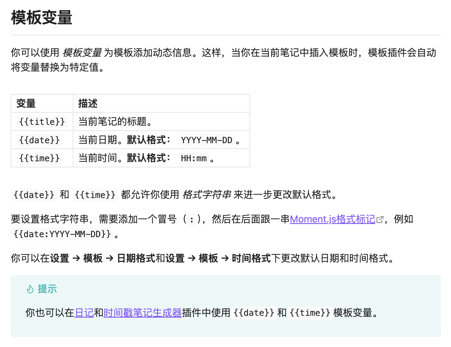 下图是Obsidian官方提供的模板变量,就三个!!!哪里够用啊!我当时看到的时候就是两眼一黑!