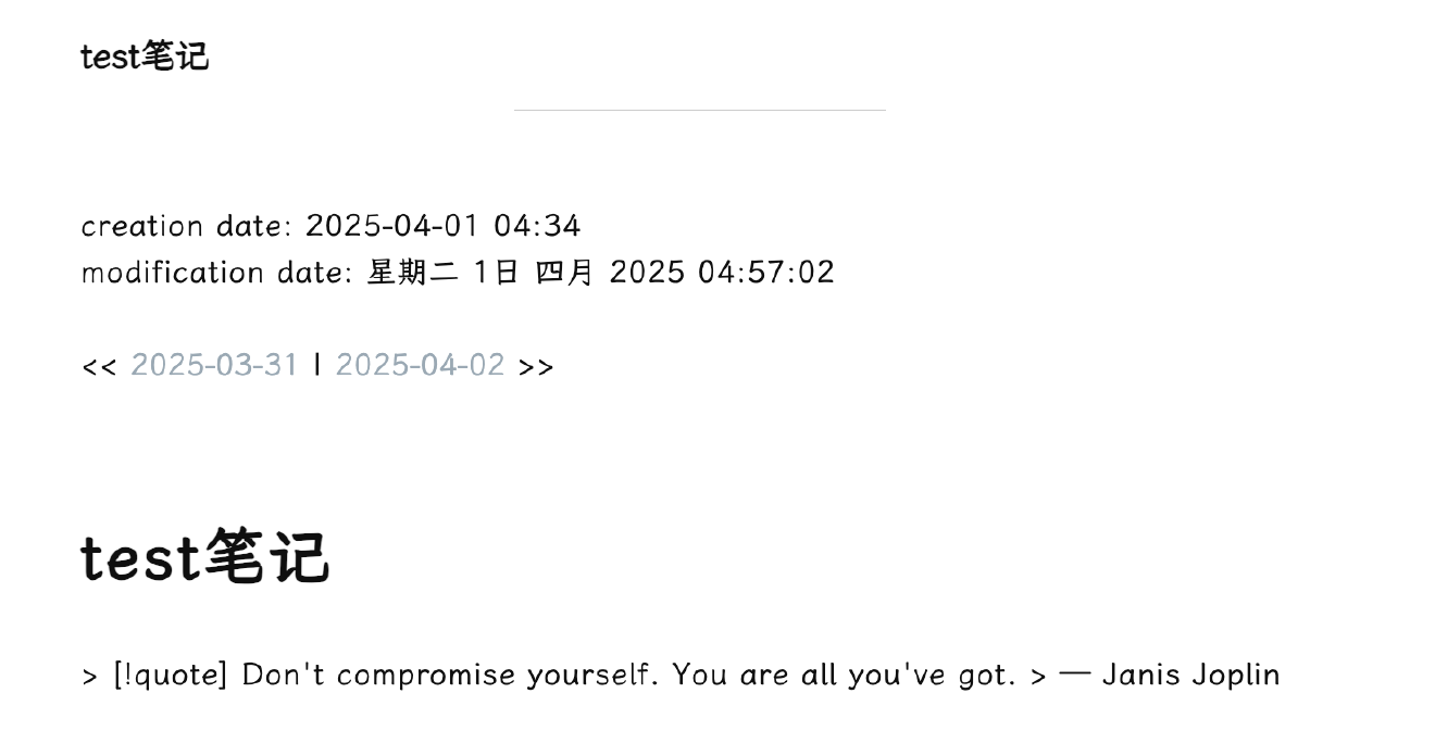 - 有些组件(最下面的Quote)展示出了不一样的效果,第三步的Quote无法成功加载,进行预览模式后还是字符串的形式。 所以更推荐第四步这个方式去利用模板生成新笔记。