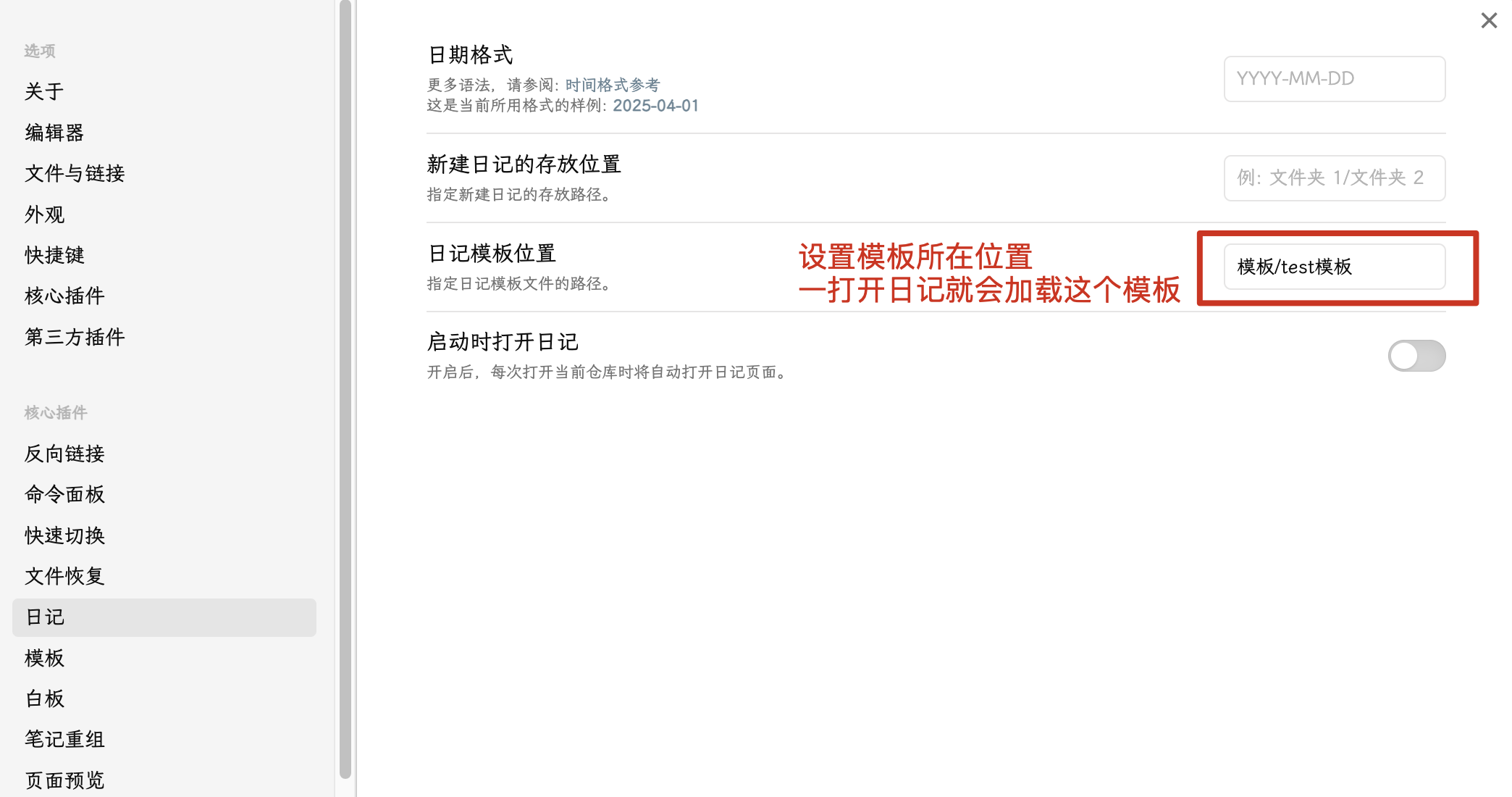 - 还有一种使用模板的方式是通过日记(或者其他周记月记插件)利用这个模板直接生成新笔记。下面我用官方的日记功能演示: